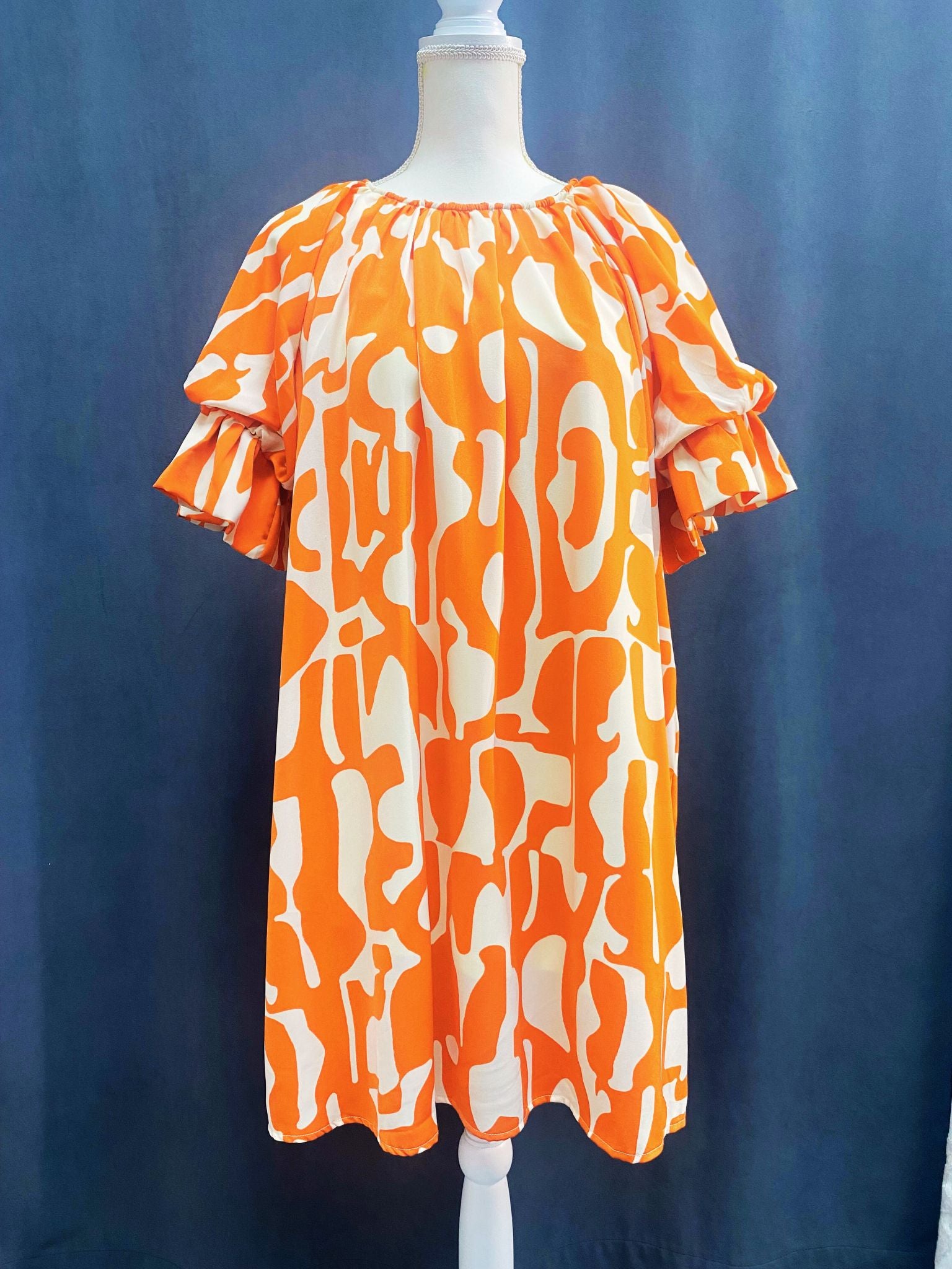 Retro-inspired dress in orange and white. Can be worn as a dress or blouse.